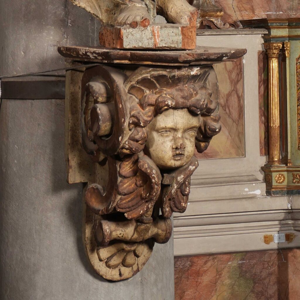 Queste mensole, collocate come base di supporto ai quattro angeli disposti sulle colonne delle navatelle del coro nella pieve di Monte San Savino, corrispondono a un buon lavoro di intaglio ligneo realizzato da un artista perugino attivo intorno alla prima metà del XVII secolo. Le mensole sono quattro in totale, divise in due differenti tipologie di stessa fattura, che ben si sposano con lo stile dei due angeli alati posti all’estremità sinistra e destra del coro. Le due basi esterne sono costituite da una struttura angolare raccordata ai lati da una voluta a ricciolo serpentinata e spiraliforme, che termina il basso con una modanatura tripartita e incurvata, mentre al centro figura un volto angelico, che riprende le medesime fattezze dei due angeli posti ai lati del coro. La protome, infatti, presenta un volto paffuto, con gote turgide e capelli fluenti, disposti a ciocche gonfie; le ali, stilizzate, si raccordano di fronte al volto dell’angelo. Le due basi delle colonne più interne, invece, a sinistra e destra dell’altare, sono più ricche nell’intaglio e nei volumi, ma la doratura è andata perdendosi. Anch’esse si legano alle altre per la forma della base, con voluta laterale arricciata, anche se più ricca, così come il volto dell’angelo con capelli più gonfi, corrispondenti allo stile dell’angelo soprastante, e ali aperte sul davanti, terminanti in basso con una modanatura a forma di cartiglio arrotolato e un semicerchio con decorazione floreale.