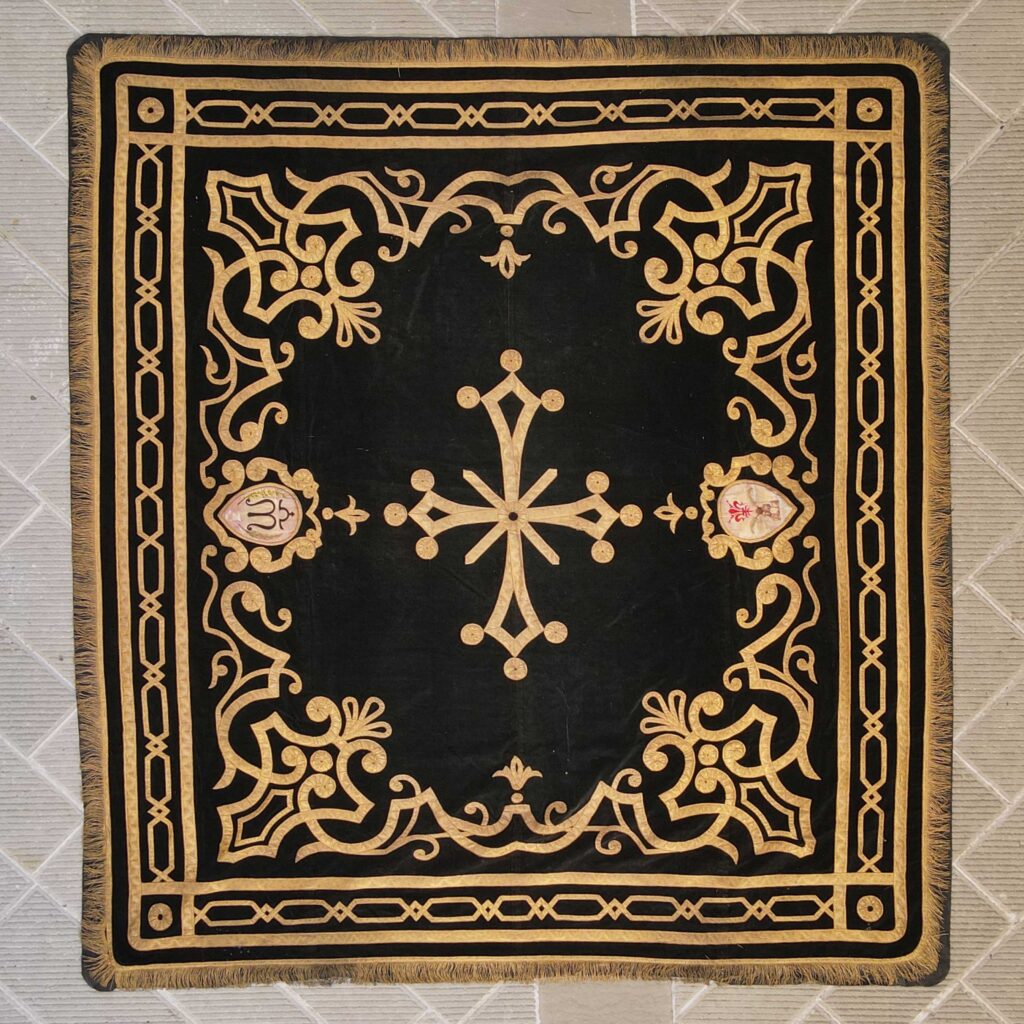 Si tratta di un grande telo di velluto nero decorato lungo il perimetro da un gallone dorato affiancato ; lungo l’interno da decorazione a strisce parallele e losanghe incrociate.; Sui due lati più lunghi sono presenti i due stemmi, uno del Comune di Monte San Savino e uno della Misericordia,; i due ovali, sono posti dentro motivi decorativi a volute.fitomorfe. Si tratta di un accessorio usato durante i trasporti su lettiga trasportati da spalloni, in cui la bara veniva coperta dal drappo; per i motivi decorativi e gli stemmi presenti è da ritenersi post unitaria.
