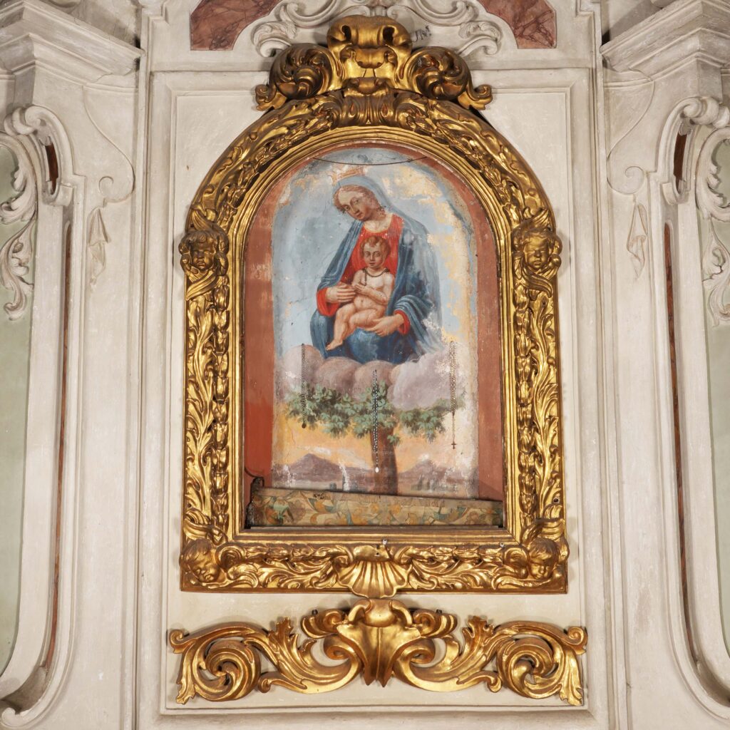 Questa cornice lignea intagliata e dorata custodisce l’affresco dedicato alla Madonna delle Querce, proveniente dalla località “Il Corniolo” e oggi ubicato nel terzo altare a destra della Pieve dei Santi Egidio e Savino a Monte San Savino; essa è costituita da due corpi distinti che si arricchiscono di elementi simbolici, allusivi alla Verginità di Maria e alla sua Immacolata Concezione, e si compone di una battuta a gola liscia e una controbattuta aggettante, entrambe circondate da un doppio giro di elementi ornamentali fitomorfi: il primo livello, più interno, è caratterizzato dalla presenza di filari di foglie e bacche di alloro, tradotti in forma sintetizzata, simbolo di Gloria e di Resurrezione, mentre esternamente delle lingue fiammeggianti di foglie di acanto si arrampicano lungo tutta l’ampiezza della cornice, intervallate ai due estremi inferiori e superiori da testine di cherubini alati. Sulla cimasa campeggia una grande foglia di quercia accompagnata da due decori fitomorfi, che coronano l’affresco mariano, arricciandosi verso l’interno con andamento tripartito. Il corpo distaccato, che fa da basamento rettilineo al dipinto, è costituito da due riccioli di volute fogliacee chiuse in forma di spirali con andamenti opposti, riuniti al centro in una composizione lanceolata. Un inventario della Confraternita del 1861 descriveva questa cornice con queste parole: “(…) Una magnifica cornice in legno maestrevolmente lavorata e dorata con cristallo, sotto il quale una tendina di seta fiorita che ricopre l’Immagine della Madonna avente un filo di corallo al collo (…). In fondo e nel mezzo della cornice si trova un angioletto di legno dorato in tutto rilievo sorreggente un viticcio a tre lumi”; il putto in atteggiamento orante di cui si parla nell’inventario, oggi staccato dalla cornice e conservato presso i locali della Misericordia, è coperto da uno svolazzante panneggio con effetto bagnato e increspato e in origine stava seduto sopra la valva di conchiglia posta alla base del manufatto, simbolo cristiano dell’Immortalità dell’anima.