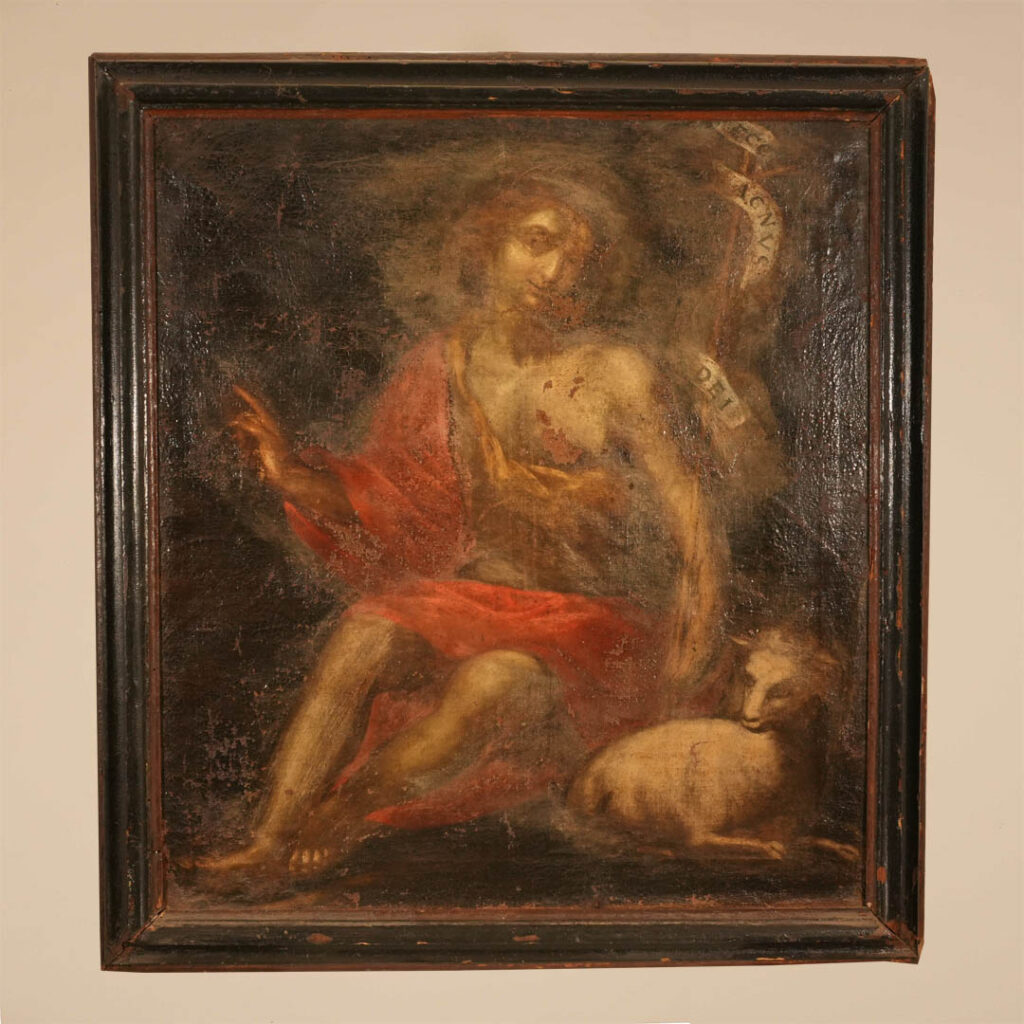 Questo dipinto raffigurante san Giovanni Battista si pone in continuità con una tradizione iconografica cominciata da Caravaggio e proseguita per tutto il Seicento, secondo la quale il Battista veniva raffigurato nella sua età adolescenziale, seduto tra le rocce in compagnia del solo agnello che pasce ai suoi piedi; fu Caravaggio, infatti, a dotare il san Giovanni di un aspetto solitario e dimesso, collocando il Battista su uno sfondo naturale e vestendolo con drappo rosso, come già era in uso fin dal Rinascimento. Il santo è qui raffigurato seduto, affiancato dall’Agnello, a cui si riferisce il cartiglio annodato intorno al suo vincastro che termina con una croce e che ricorda Gesù come Agnello di Dio. Il volto dolce e aggraziato del Battista si sposa con il gesto della sua mano destra, con la quale egli punta il dito indice verso l’alto, ripetendo il gesto fatto dal Battista nell’opera di Leonardo, che ricorda al fedele di pensare sempre alle cose del Cielo.