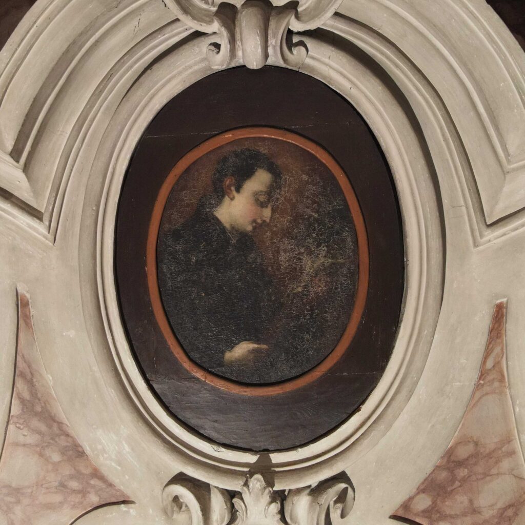 Questo tondo è dedicato a San Luigi Gonzaga, appartenente alla Compagnia del Gesù, vissuto nella seconda metà del XVI secolo e proclamato santo nel 1726 da Papa Benedetto XIII. Il tondo è sormontato dallo stemma della corporazione dei calzolai, che pagarono 24 scudi a Pietro Materno Speroni per la realizzazione dell’altare in stucco in occasione dei restauri alla chiesa promossi da Anton Leone Restorelli alla metà del XVIII secolo. I calzolai, già titolari dell’altare dalla fine del XVII secolo, sono celebrati anche nel dipinto di Domenico Sozzini che figura al centro dell’altare con la Madonna e i santi (alla cui scheda si rimanda), tra i quali sono presenti i Santi Crispino e Crispiniano, protettori di questa corporazione, di cui oggi nel dipinto si vedono solo porzioni ridotte dei corpi, così modificati per riadattare il dipinto seicentesco all’altare in stucco della metà del XVIII secolo. Il dipinto con san Luigi Gonzaga è collocabile cronologicamente nella prima metà del XVII secolo, all’epoca in cui venne istituito l’altare del Carmine, sopra il quale l’opera risulta collocata fino al 1861, quando un inventario dei beni della Confraternita di Misericordia racconta: “nell’Altare del Carmine un Quadro ovale con Cornice e cristallo portante l’Immagine in pittura di San Luigi Gonzaga più una Croce con Crocifisso in ottone sopra una (?) dorata che hanno a base tre monti di legno“; a conferma della datazione di questo dipinto alla prima metà del XVII secolo si osservi l’assenza del nimbo sopra il capo del santo, che all’epoca dell’esecuzione del dipinto era stato solo proclamato beato nel 1605 e non ancora canonizzato; la proclamazione a santo sarebbe avvenuta nel 1726. Il tondo con san Luigi Gonzaga è stato spostato, dopo il 1861, sopra l’altare dedicato a san Filippo Neri, in sostituzione dell’ovale con i santi Antonio da Padova e san Francesco di Paola, che oggi si conserva nella sagrestia della pieve e alla cui scheda si rimanda.