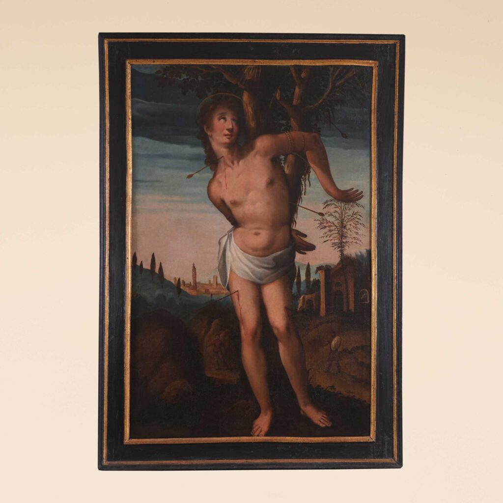 Il santo compare in primo piano, vestito del solo perizoma, legato ad un albero, il cui corpo è trafitto da varie frecce. Sullo sfondo un cielo al tramonto dai toni blu e una città in lontananza, circondata da mura e caratterizzata da case torri ed un alto campanile; sulla sinistra appaiono delle colline con cipressi; sulla destra e’ presente un piccolo edificio con , in lontananza, pastori e contadini.