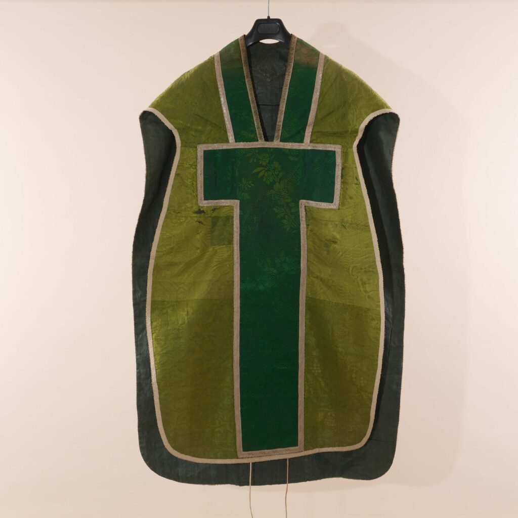 Pianeta di broccato seta restaurata alla fine del secolo scorso con stoffa verde in stile; la parte originale è visibile ai lati, in broccato di seta verde, con motivi a pigna su rami ad andamento curvilineo terminanti anche con foglie di vite e grappoli di uva; la fodera è in lino di seta grigia.