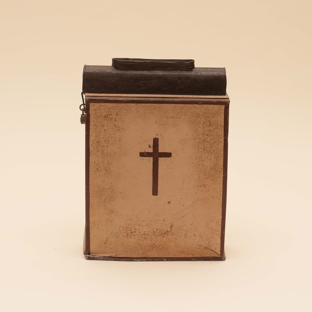 La teca raccogli elemosine, rettangolare, in metallo dipinto di ocra e marrone, con croce centrale è un esempio locale di oggetti destinati alle funzioni secondo il principio di sobrietà che la Confraternita si impose dall’inizio.