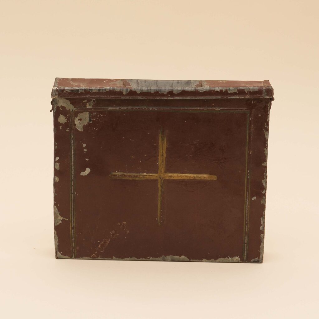 Serie di due raccogli elemosine a tasca, di metallo dipinto in marrone, con croce dorata al centro e cornicetta semplice; si tratta di semplici oggetti di produzione locale ascrivibili al XIX secolo, in linea con le scelte di semplicità e parsimonia della Confraternita.