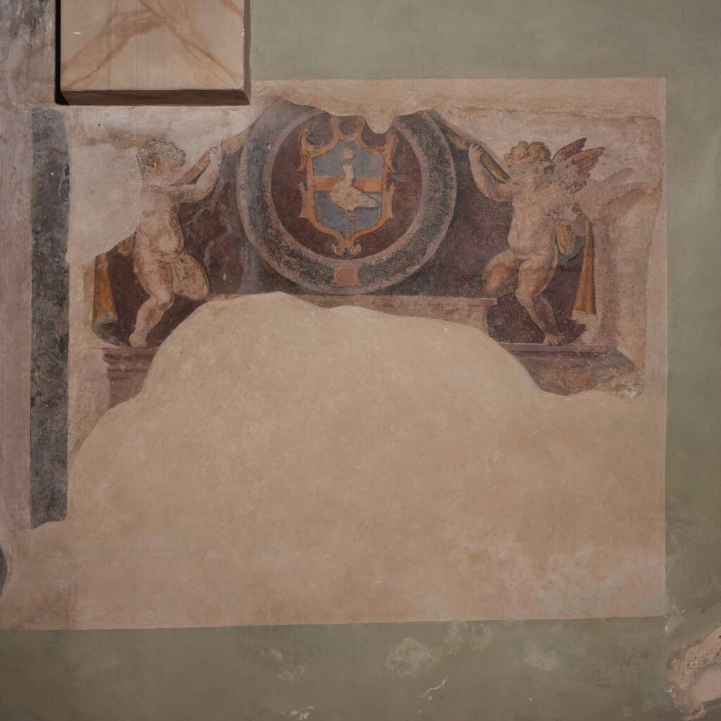 Questo stemma dipinto ad affresco, collocato nell’area di passaggio del coro della pieve di Monte San Savino, è stato avvicinato da Giuliano Centrodi all’attività giovanile di Orazio Porta, ma condivide soluzioni stilistiche ed iconografiche diffuse anche negli ambienti umbri, da artisti al servizio del cardinale Fulvio Giulio della Corgna, tra 1575 e 1583, come Salvio Savini o Nicolò Circignani detto il Pomarancio; del primo si ricordano gli affreschi della villa di Città della Pieve da lui firmati nel 1581, tra i quali si ricordi il fregio del ciclo pittorico intitolato “La Retorica” del salone d’onore posto al primo piano, dove i puttini, con le loro carni turgide e consistenti, si muovono gioiosamente mentre mostrano gli stemmi delle casate lì celebrate. Il Pomarancio, invece, tra 1574 e 1590 guidò un’equipe di pittori incaricati di affrescare le sale del palazzo della Corgna a Castiglione del Lago con scene storico-mitologiche e che celebrassero le gesta di Ascanio della Corgna. All’ingresso del percorso egli si rese autore in prima persona dei dipinti della volta con il “giudizio di Paride”, creati come allegoria per celebrare il matrimonio di Diomede della Corgna, nipote e figlio adottivo di Ascanio, con Porzia Colonna; intorno alle scene narrative si dispongono una serie di stemmi, tra cui quello del cardinale Fulvio della Corgna, fratello di Ascanio, unito a quello dei Ciocchi del Monte, casato di papa Giulio III e di Giacoma, madre di Ascanio e Fulvio Giulio della Corgna. Il suo stile si avvicina molto a quello di questi affreschi e di quelli ad esso adiacenti, come si evince comparando la decorazione ad affresco da lui eseguita nella chiesa romana del SS. Nome di Gesù all’Argentina del 1584, dove testine di cherubino, putti e angioletti riprendono movenze e dettagli condivisi. Il gusto di quest’opera è altresì riconducibile a quello proposto dalla cerchia dell’Allori presso gli Uffizi, dove il trionfo della grottesca si sposava bene con il linguaggio tardo manierista proposto dagli allievi dell’Allori come Giovanni Bizzelli o dal giovane Bernardino Poccetti, legati all’attività del Porta.