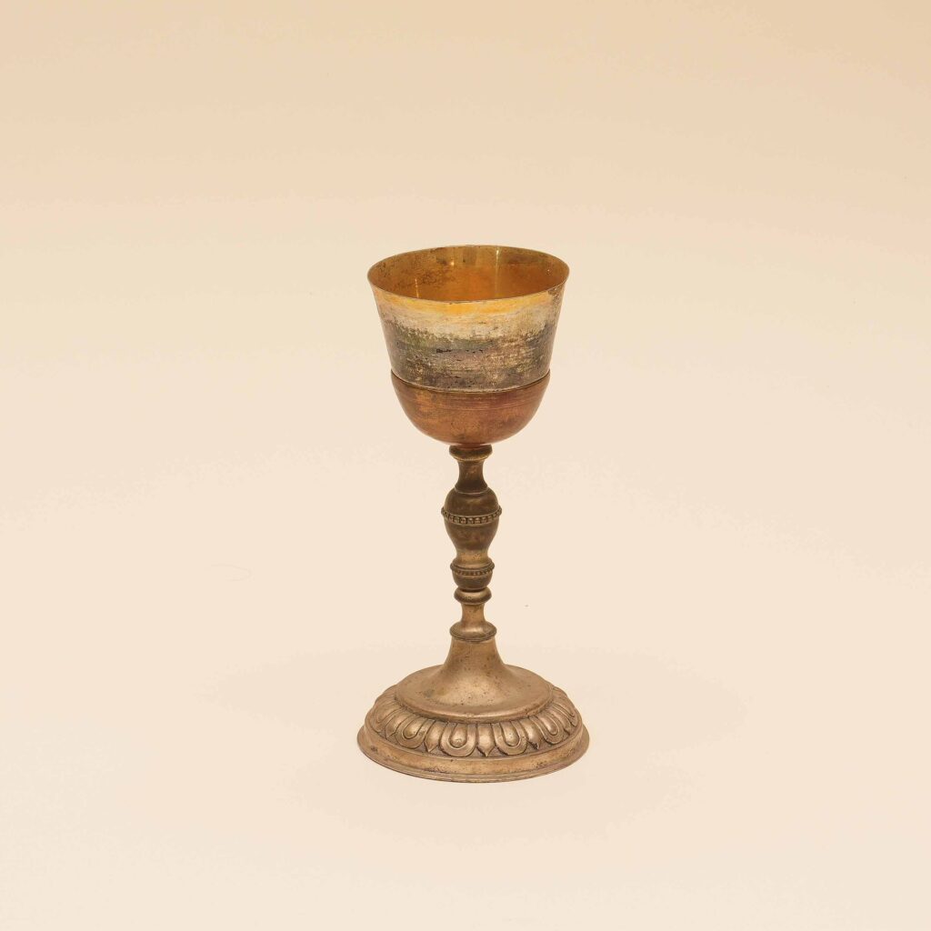 Su piede circolare in ottone , modanato con giro di foglie lanceolate, si imposta il fusto formato da rocchetti modanati e nodo a pera con perlinatura decorativa; al di sopra coppa svasata con sottocoppa liscio dorato; la coppa è argentata e dorata all’interno.