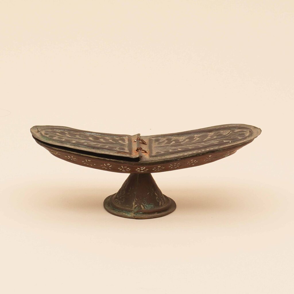 Su semplice base circolare con fusto breve liscio si regge la coppa, di forma molto allungata ovale con due sportelli. Sul piede e nella coppa motivi a rosetta; sugli sportelli motivi a foglie di acanto. Si tratta di un modesto esempio di navicella porta incenso destinato ai funerali; è ascrivibile a fine XIX secolo, di produzione locale..