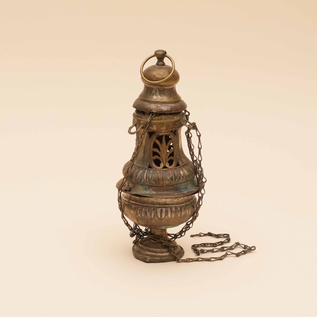 Il turibolo su base circolare modanata con coppa baccellata e coperchio traforato a foglie di acanto con motivi a foglie lanceolate; il sovracoperchio su cui si applica l’anello, è modanato; catenelle ad anello.
