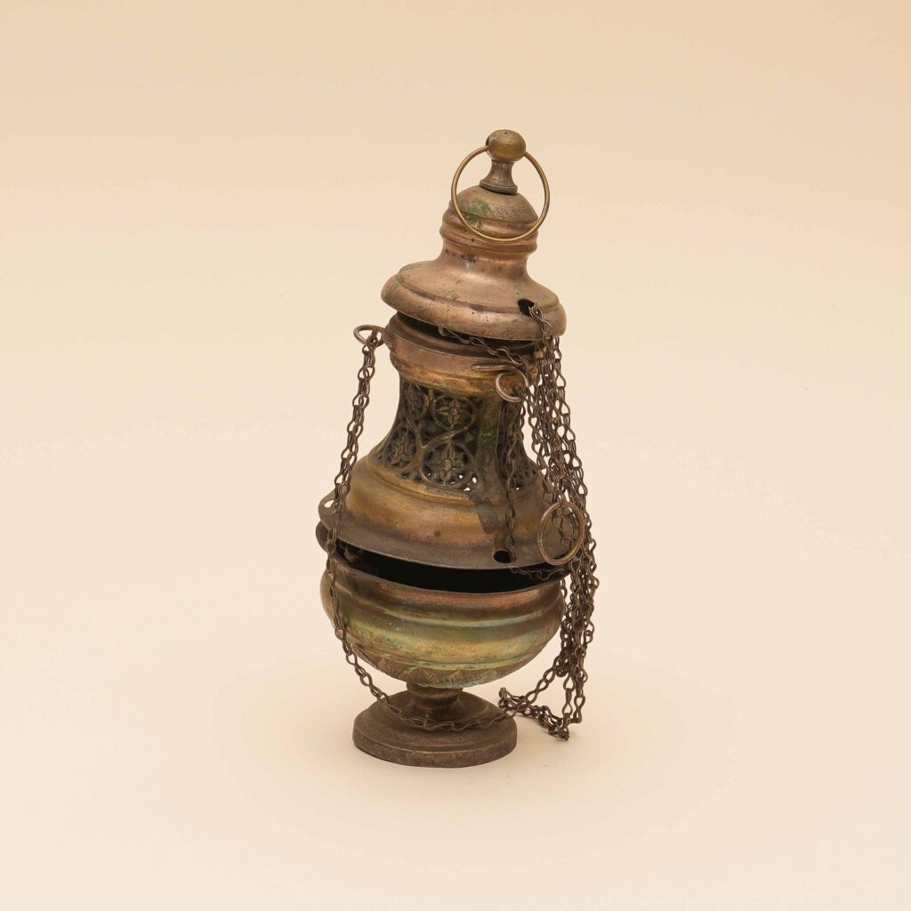 Su base circolare decorata da foglie incise lanceolate, piede rialzato e modanato che sorregge coppa modanata decorata, al di sotto da foglie lanceolate; il coperchio è a traforo con motivi di foglie di acanto in girali; il coperchio è rastremato e modanato con sfera modanata a terminale a cui si applica la catenella; la struttura dell’oggetto semplice e modanato si collega alla produzione razionalista toscana, ma le foglie lanceolate di sapore neoclassico e soprattutto la decorazione a traforo, di sapore new gothic, spostano la datazione a fine secolo XIX.