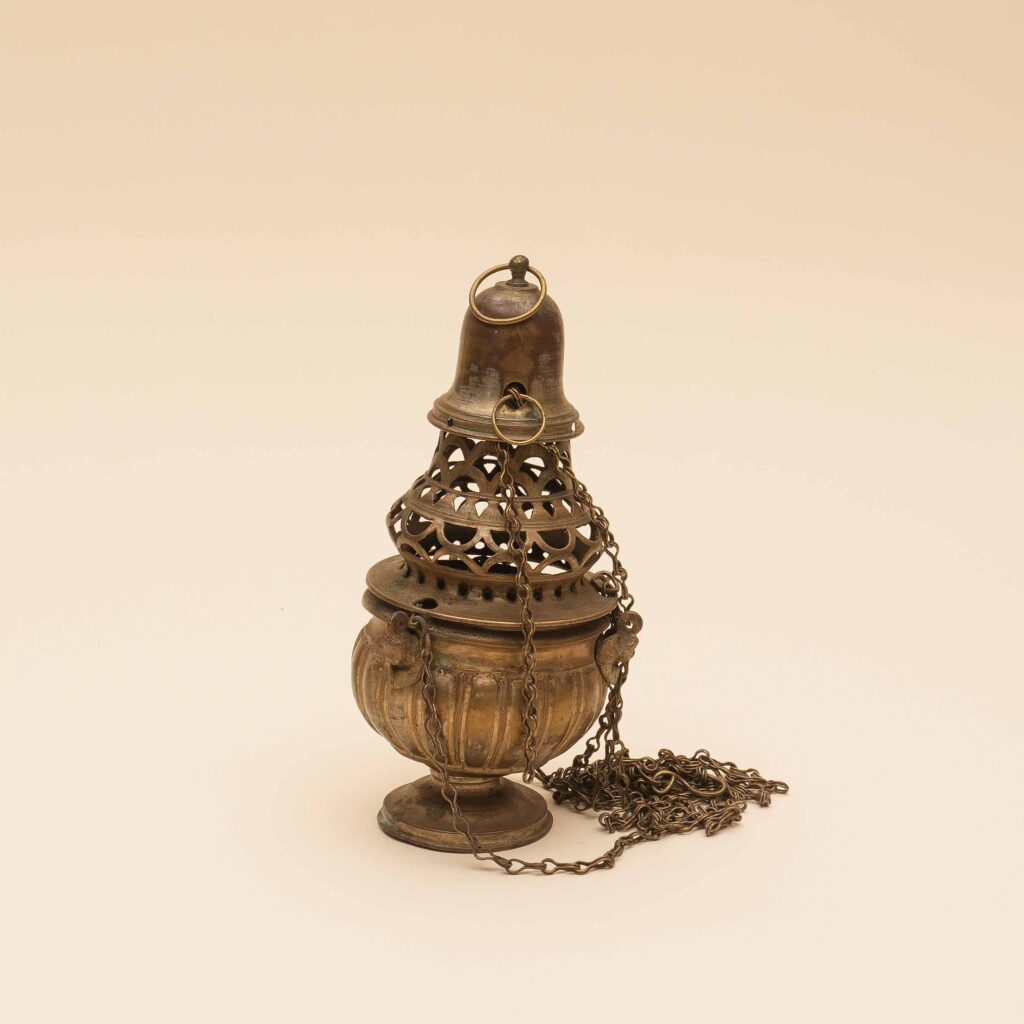 Su base rotonda bombata e modanata si alza la coppa baccellata con testine di angioletti; il sovracoppa, bombata, a traforo; sull’apice un motivo modanato su cui è collocata la catenella. Si tratta di un semplice esempio di ottone argentato, destinato all’uso liturgico, che per tipologia e caratteri si ascrive a produzione toscana di fine secolo XVIII.