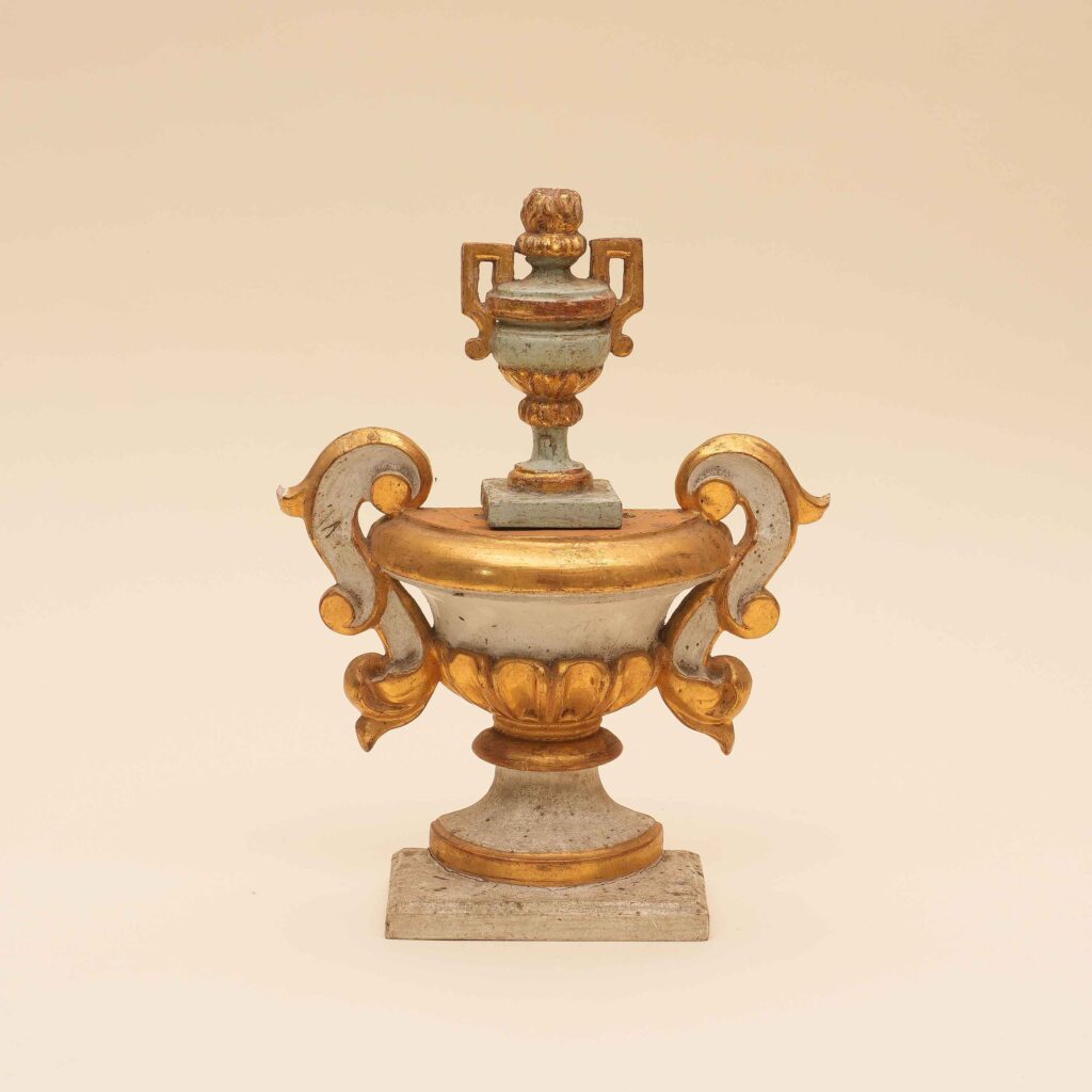 Su base quadrata il piede rialzato con modanatura dorata e anello dorato su cui si imposta struttura a vaso con baccellatura dorata decorata da morivi a tralcio laterali e con al di sopra piccolo vaso con base circolare modanata e baccellata d’oro con anse quadrate. Si tratta di un frammento appartenente ai primi decenni del XVIII secolo per i motivi decorativi rococo’ con rimandi ancora seicenteschi come la baccellatura. E’ di produzione toscana.