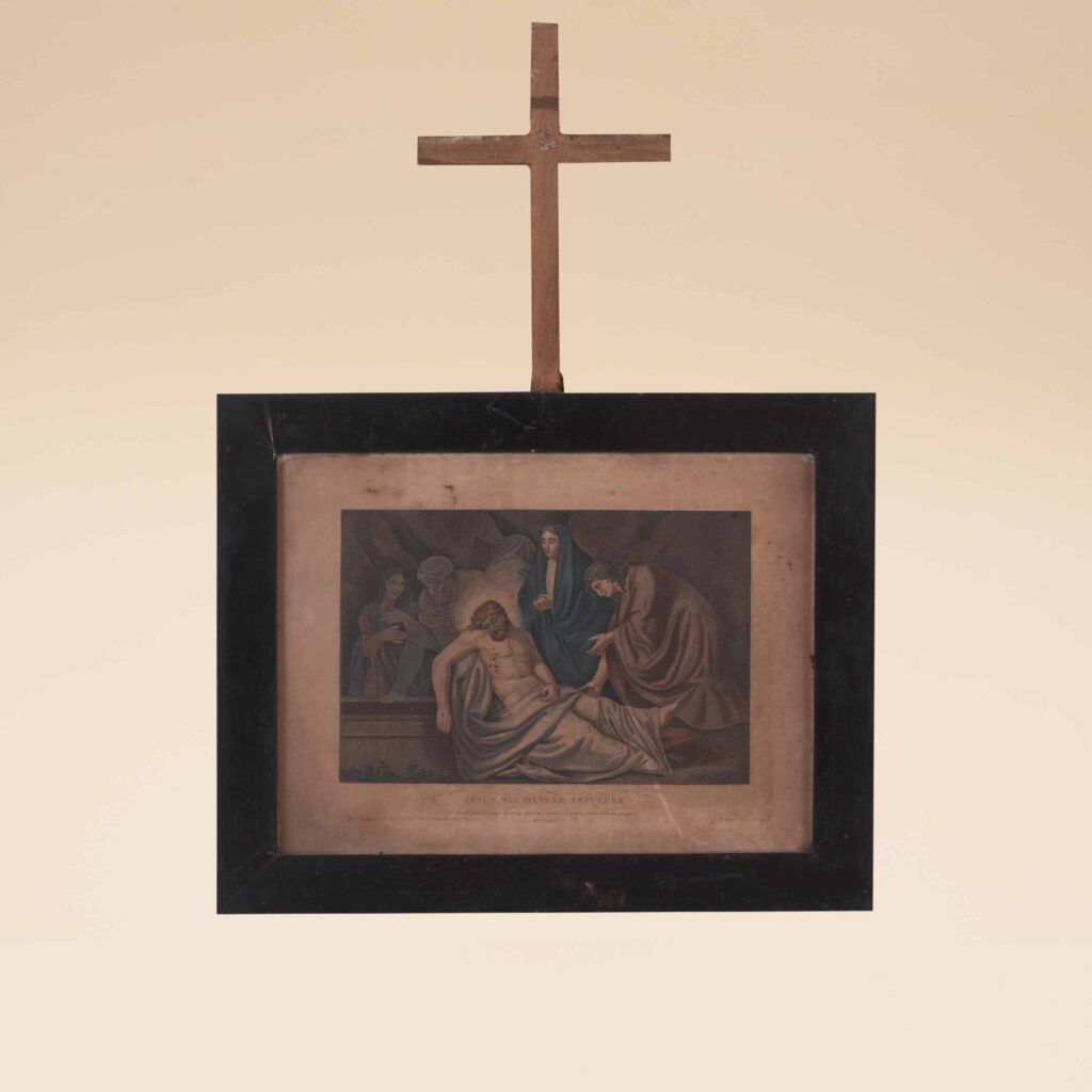 Si tratta di una serie dedicata alle 14 stazioni della via Crucis, incise ed acquarellate con cornici semplici di legno con crocetta apicale semplice, dipinte in nero. Si tratta di una Via Crucis, molto frequente in Italia ed in provincia (vd. chiesa di S. Maria in Gradi di Arezzo) che furono prodotte dalla ditta dei litografi Turgis, parigini, durante tutto il XIX secolo; solo dal 1891 Louis Turgis aggiunse alla ragione sociale i figli (L. Turgis et filis); essi si occuparono della conquista dei mercati esteri sia americani che europei con incisioni a soggetto religioso, acquarellate.