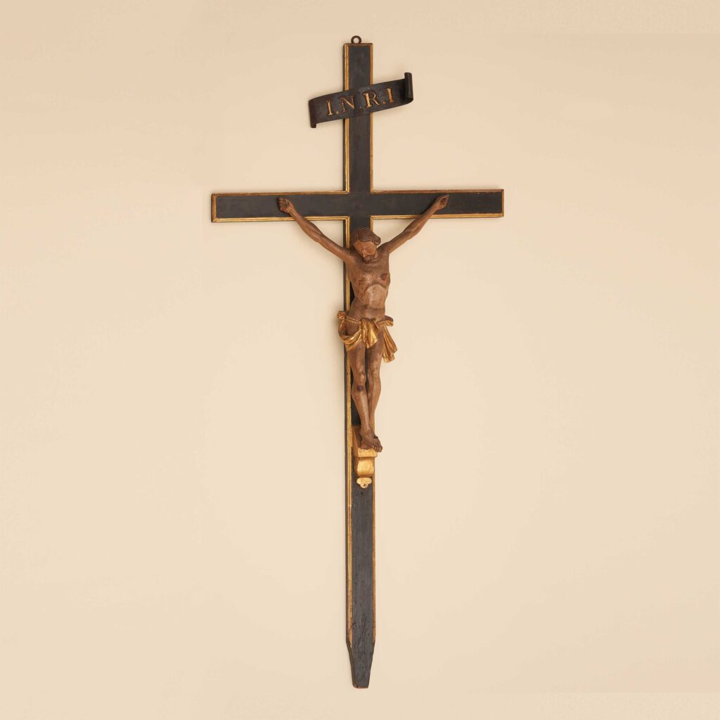 Il crocifisso, a parete, ha bracci lisci dipinti di nero con bordi dorati, con cartiglio in alto con scritta INRI; su piedistallo dorato, il Cristo Patiens, intagliato e dipinto in ocra. Si tratta di un semplice manufatto, di produzione locale, di metà 800, destinato a funzione funeraria.