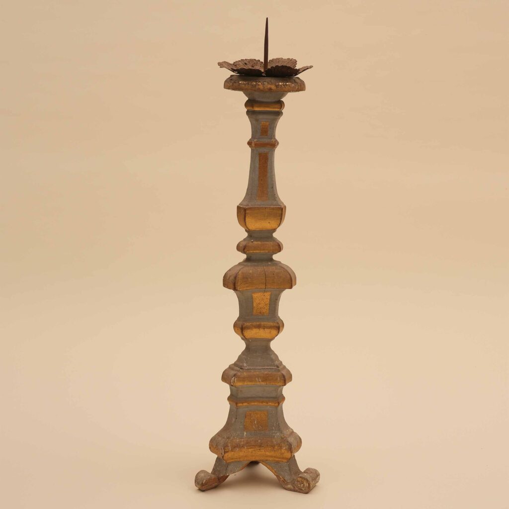 La muta comprende 11 candelieri più grandi e 12 più piccoli; su base triangolare celeste posta su volute; i candelieri sono decorati da modanature dorate e motivo a intreccio su fondo oro; al di sopra nodo a pera con lo stesso motivo e fusto a balaustro con bordi dorati che sostiene piattello bombato; i 6 posti sull’altare maggiore, presentano sulla base, dorata la M di Maria Vergine. La muta, di bella fattura, rientra nello stile toscano di inizio secolo, caratterizzato da forme geometrizzanti decorate da modanature.