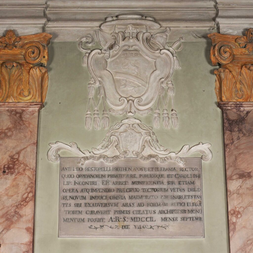 ANT: LEO RESTORELLI PROTHON APOST: ET PLEBANIAE RECTOR,/ QUOD OPPIDANORUM PRIVATO AERE PUBLICOQUE ET CAROLI PHI/LIP: INCONTRI EPI: ARRET: MUNIFICENTIA. SUA ETIAM/ OPERA ATQ:IMPENDIO PRAECIPUO TECTORIUM VETUS DELE/RI, NOVUM INDUCI, OMNIA MARMORATO EXORNARI, ET STAN/TES SIBI EXADVERSVM ABAS AD FORMAM REFICI ELEGA/TIOREM CURAVERIT PRIMIUS CREATUS ARCHIPRESB: MONU/MENTUM POSUIT. A:R:S: MDCCIL MENSE SEPTEMB:/DIE VII.