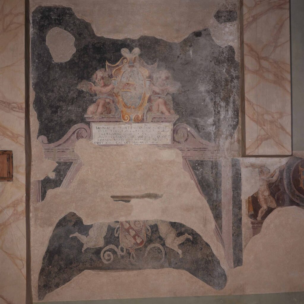 Gli stemmi della famiglia Del Monte, seppur di epoche diverse, dimostrano l’importante ruolo svolto da questa famiglia a Monte San Savino, città natale del papa Giulio III, che non si dimenticò delle sue origini e della pieve del suo paese, tanto da aver progettato nel 1550 di assurgere a diocesi Monte San Savino. L’epigrafe ad affresco, inserita in un tabellone, rappresenta un omaggio da parte di Ascanio (1516-1571) e Fulvio Giulio della Corgna (1517-1583) alla “madre amorevole” Iacoba di Monte (1492-1559), sorella del papa Giulio III e nipote di Fabiano di Monte, che si era unita in matrimonio a Francesco della Corgna e che nel 1550 aveva ottenuto dal fratello i territori del Chiugi perugino, Castiglione del lago, Montalera, Montecolognola e Bastia, giungendo a capo nel 1563 del Marchesato di Castiglione, del Chiugi e Castel della Pieve, più tardi divenuto ducato. Ella morì nel 1559, all’età di 68 anni, come si evince dal cartiglio qui collocato, avendo nella sua vita molto operato a Monte San Savino, ad esempio come “hospitalaria” dell’ospedale comunale di Santa Maria, nel quartiere Vertighe di Sopra, garantendo l’accoglienza dei pellegrini e dei poveri. Nell’ottobre 1551, nella visita pastorale condotta dal vescovo Minerbetti, si raccontava anche delle frequentazione che Iacoba ebbe con il monastero “de Castro” di Monte San Savino, dove aveva scelto tre suore, Lucrezia, Elisabetta e Filiziana, per servire e obbedire al pontefice Giulio III, suo fratello. Fulvio della Corgna, ammesso fin da giovane all’ordine dei cavalieri di Malta, ricordato nell’iscrizione come cardinale, faceva parte della corte dello zio cardinale Antonio Maria Ciocchi del Monte ed era divenuto vescovo e cardinale prete, aiutato da Giulio III; Ascanio della Corgna, condottiero, aveva preso parte al noto duello fiorentino contro Giovanni Taddei nell’ambito della guerra che vide contrapporsi Francesco I di Francia e Carlo V di Spagna. Quest’ultimo svolgeva a Monte San Savino un ruolo diplomatico di garante di giustizia, come ricorda una visita pastorale condotta nel 1561, nella quale il figlio di Iacoba di Monte si occupava di risolvere delle controversie scaturite in ambito di compravendita da tra Nero Galletti, pievano della pieve dei Santi Egidio e Savino, e Iacopo Restorelli. Nella sezione sottostante l’affresco ha perduto gran parte della cromia, rimanendo visibile solo come una semplice sagoma, privata degli azzurri che dovevano fare da sfondo alla campitura dell’arme Di Monte; ciò ci induce a riflettere sulla possibilità che questa porzione inferiore fosse di epoca precedente rispetto all’arme coi due puttini sovrastanti, di impianto pienamente tardo manierista, come si evince anche dall’andamento sintetico dei nastri filiformi che circondano lo stemma inferiore o dall’assenza delle volute modanate ad arricchire l’impianto dello scudo della nobile famiglia, che invece figurano sulla parte alta dell’affresco.