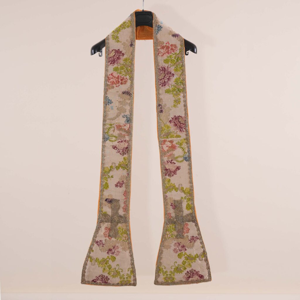 La stola fa parte del parato che comprende anche la pianeta e la borsa; è in broccato di seta bianca, con disegno a meandro su pizzo, con rami di foglie intervallate da dalie rosa e porpora e mazzetti di fiori blu; è circondata da galloni in argento e presenta fodera di restauro gialla. Per il suo elegante naturalismo e il tipo di decorazione rientra nella produzione manifatturiera toscana di metà del XVIII secolo.